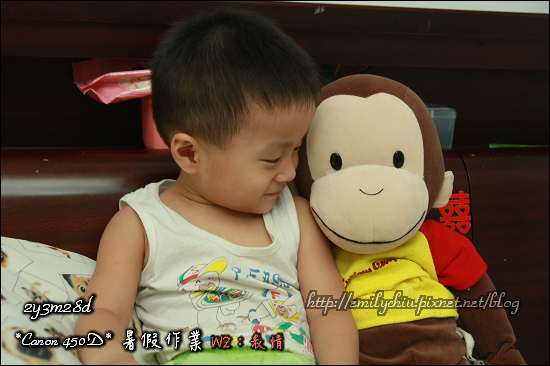 W2題目:表情Canon 450D+17-70mm地點:家中承穎與喬治猴兩個好像麻吉一樣睡覺前承穎一定要跟喬治猴說晚安或抱抱